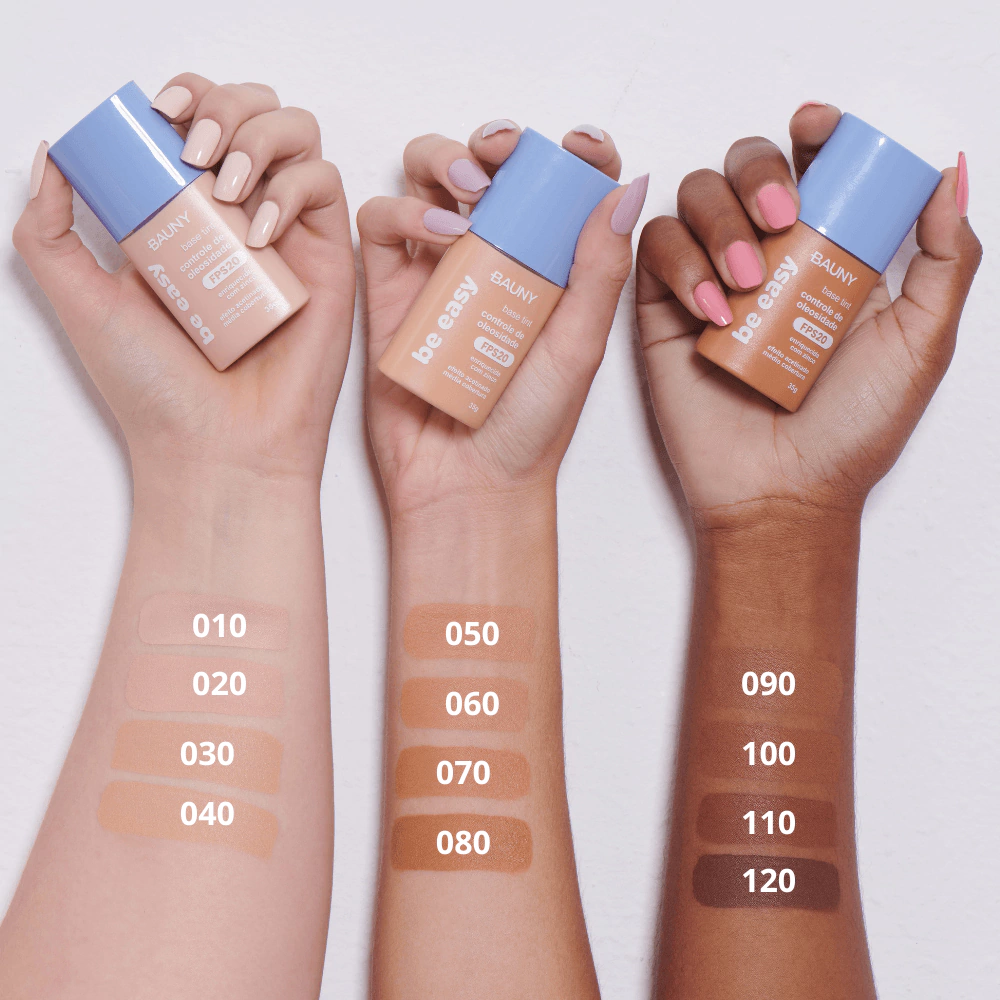 A Base Be Easy é uma base Tint de efeito acetinado enriquecida com Zinco - um poderoso ativo que atua no controle de oleosidade excessiva da pele, tem efeito calmante anti-inflamatório e ajuda no controle da acne. Além disso, está disponível em 12 tonalidades.